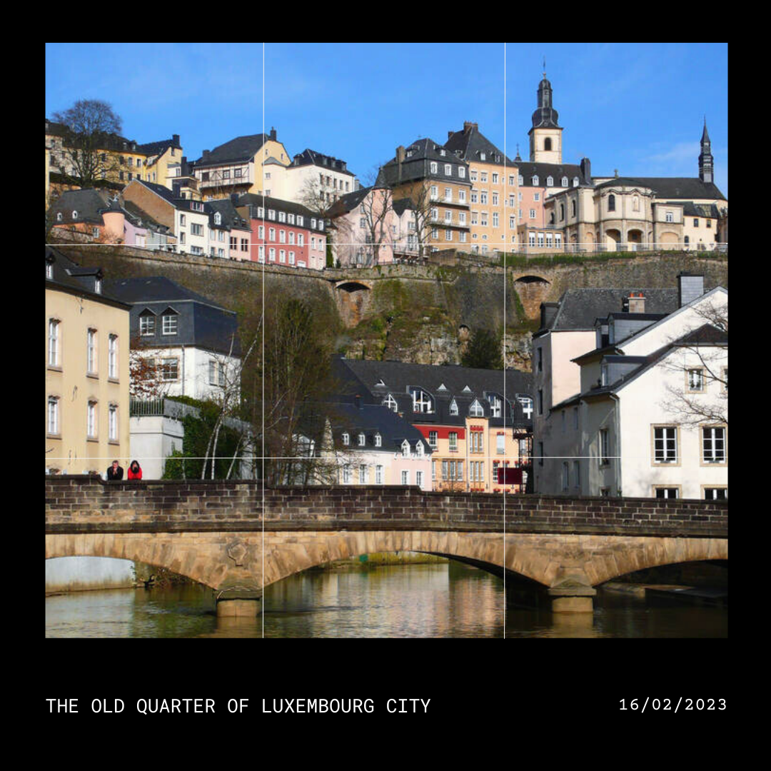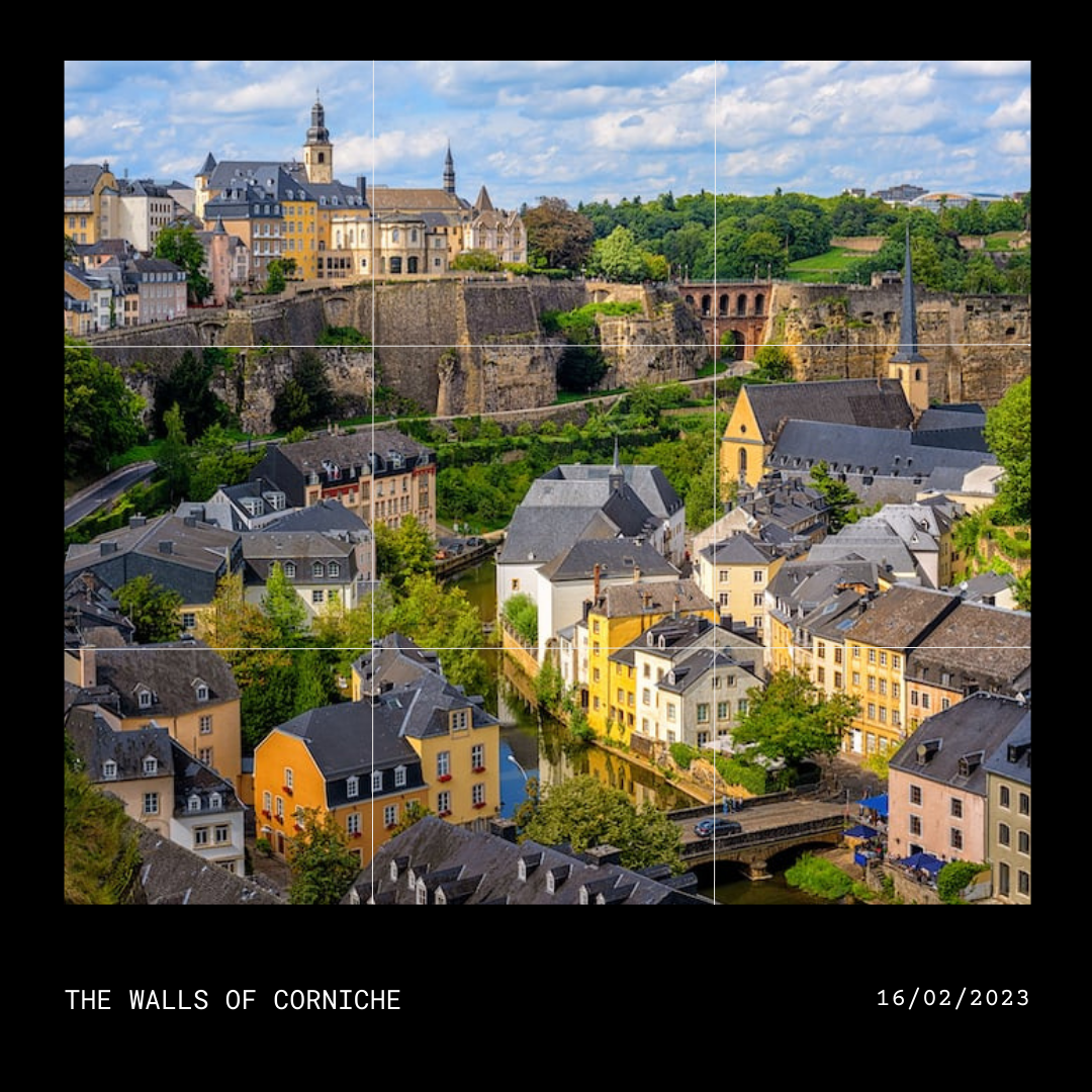 กำแพงคอร์ริช ได้รับสมญานามว่า ระเบียงที่สวยที่สุดในยุโรป ตั้งอยู่บริเวณป้อมปราการ Chemin de la Corniche สร้างโดยฝีมือช่างชาวสเปน และฝรั่งเศสในศตวรรษที่ 17 ลักษณะเป็นระเบียงทางเดินทอดยาวไปตามแม่น้ำอัลแซตต์ (Alzette River) ไหลผ่านหุบเขาเพทรัส (Petrusse valley) สะพานหินโค้งขนาดใหญ่ที่สุดในโลก หรือสะพานอโดฟี่ (Arch – Bridge or Adolphe Bridge) หนึ่งในสัญลักษณ์ของลักเซมเบิร์ก