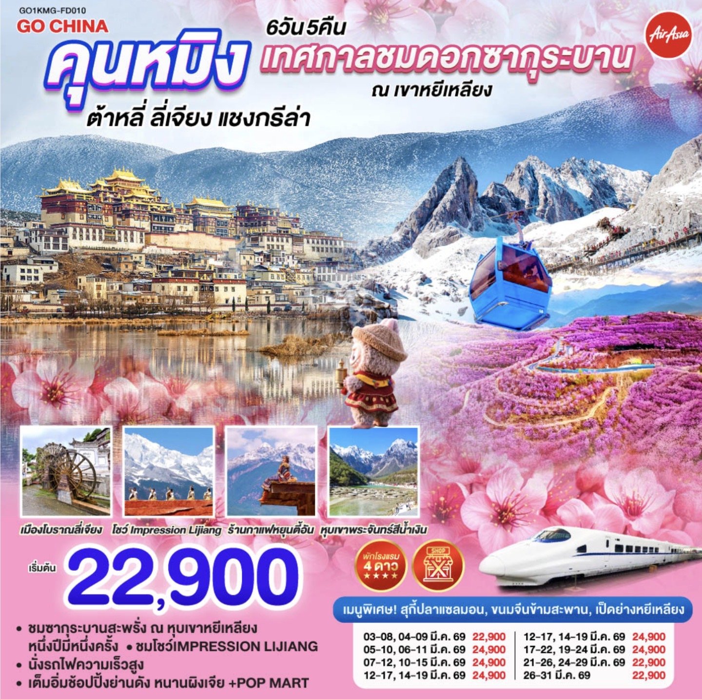 คุนหมิง เทศกาลชมซากุระบาน ณ เขาหยีเหลียง ต้าหลี่ ลี่เจียง แชงกรีล่า โดยรถไฟความเร็วสูง (ไม่เข้าร้าน) 6 วัน 5 คืน สายการบินไทยแอร์เอเชีย (FD)