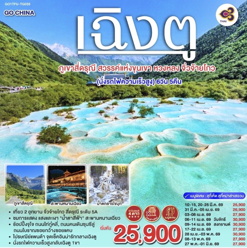 เฉิงตู ภูเขาสี่ดรุณี สวรรค์แห่งขุนเขา หวงหลง จิ่วจ้ายโกว 6วัน 5คืน (นั่งรถไฟความเร็วสูง) *ไม่ลงร้านช้อป โดยสายการบิน Thai Airways (TG)